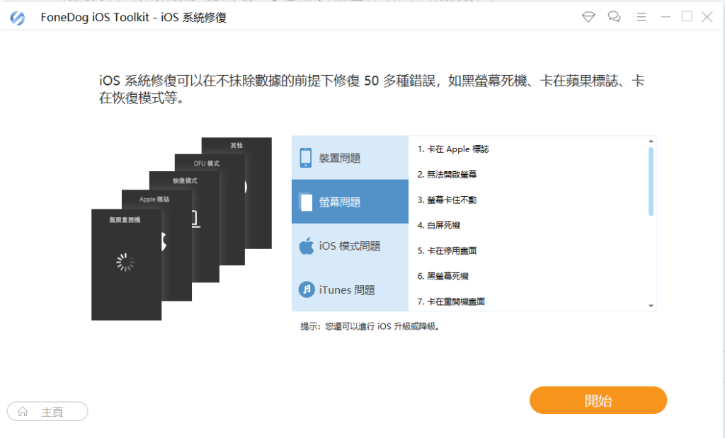通常解决苹果iOS系统问题有两种方法,FoneDog iOS Toolkit会检测当前苹果设备是否处于正常状态,并提供您有两种模式可以将您的 iPhone/iPad 恢复到正常状态。“标准模式”将修复您的设备而不会丢失数据。当标准模式失败时,“高级模式”将修复您的设备,但需要注意的是设备的所有数据都将被删除,请提前做好苹果数据备份。